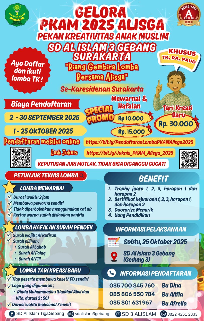 SD Al Islam 3 Gebang Surakarta dengan bangga mempersembahkan kegiatan Lomba Antar TK se-Karesidenan Surakarta dalam rangka Pekan Kreativitas Anak Muslim (PKAM) Tahun 2025. Tema tahun ini yaitu